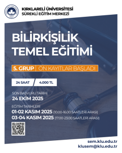 ![]() | BİLİRKİŞİLİK TEMEL EĞİTİMİ (2025/05) 13/10/2025 309 Okunma Kırklareli Üniversitesi Sürekli Eğitim Uygulama ve Araştırma Merkezi bünyesinde 01, 02, 03, 04 Kasım 2025... |