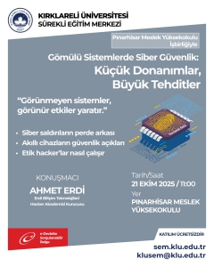 ![]() | GÖMÜLÜ SİSTEMLERDE SİBER GÜVENLİK: KÜÇÜK DONANIMLAR, BÜYÜK TEHDİTLER KONULU SEMİNER... 15/10/2025 127 Okunma PINARHİSAR MESLEK YÜKSEKOKULUNDA “GÖMÜLÜ SİSTEMLERDE SİBER GÜVENLİK: KÜÇÜK DONANIMLAR, BÜYÜK... |