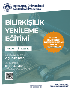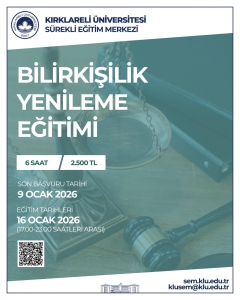 ![]() | BİLİRKİŞİLİK YENİLEME EĞİTİMİ (2026/02) 23/01/2026 172 Okunma Kırklareli Üniversitesi Sürekli Eğitim Uygulama ve Araştırma Merkezi bünyesinde 11 Şubat 2026 Cuma... |