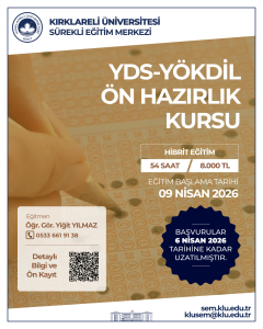 ![]() | YDS / YÖKDİL ÖN HAZIRLIK KURSU (2026/02) 23/03/2026 474 Okunma Kırklareli Üniversitesi Sürekli Eğitim Uygulama ve Araştırma Merkezi bünyesinde 09 Nisan 2026 tarihi... |