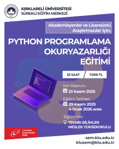 ![]() | AKADEMİSYENLER VE LİSANSÜSTÜ ARAŞTIRMACILAR İÇİN PYTHON PROGRAMLAMA OKURYAZARLIĞI EĞİTİMİ... 03/11/2025 410 Okunma AKADEMİSYENLER VE LİSANSÜSTÜ ARAŞTIRMACILAR İÇİN PYTHON PROGRAMLAMA OKURYAZARLIĞI EĞİTİMİ... |