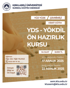 ![]() | YDS / YÖKDİL ÖN HAZIRLIK KURSU 03/12/2025 597 Okunma Kırklareli Üniversitesi Sürekli Eğitim Uygulama ve Araştırma Merkezi bünyesinde 22 Aralık 2025 itibari... |