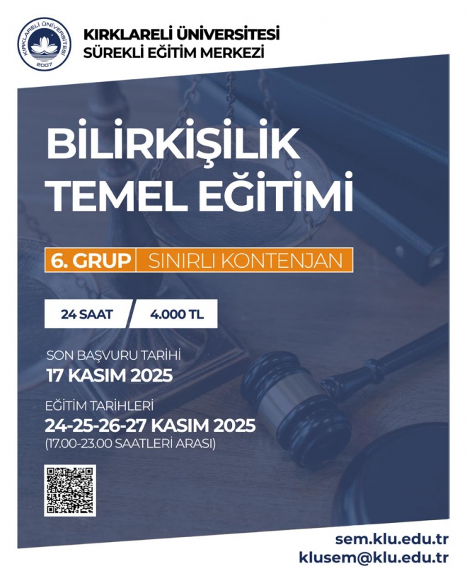 Kırklareli Üniversitesi Sürekli Eğitim Uygulama ve Araştırma Merkezi bünyesinde 24, 25, 26, 27 Kasım 2025 tarihlerinde (4 gün) Bilirkişilik Temel Eğitimi yapılması planlanmaktadır.