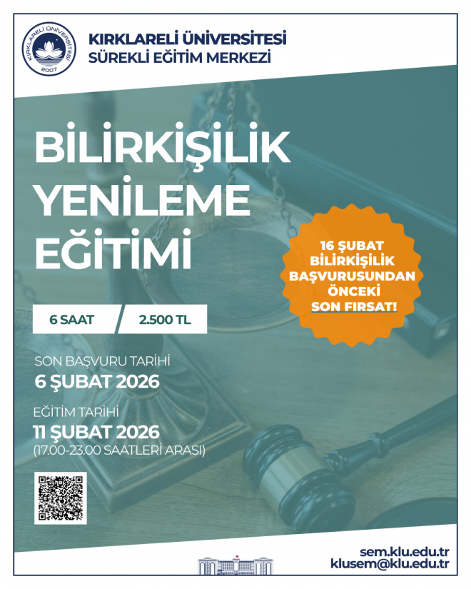 Kırklareli Üniversitesi Sürekli Eğitim Uygulama ve Araştırma Merkezi bünyesinde 11 Şubat 2026 Cuma günü Bilirkişilik Yenileme Eğitimi yapılması planlanmaktadır.