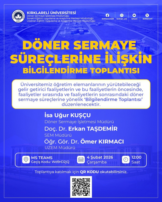 Üniversitemiz Döner Sermaye İşletmesi Müdürlüğü, Sürekli Eğitim Uygulama ve Araştırma Merkezi Müdürlüğü (SEM) ile Uzaktan Eğitim Uygulama ve Araştırma Merkezi Müdürlüğü (UZEM) iş birliğinde, öğretim elemanlarımızın yürütebileceği gelir getirici faaliyetler ile bu faaliyetlerin öncesinde, sırasında ve sonrasında yürütülen döner sermaye süreçlerine ilişkin Bilgilendirme Toplantısı düzenlenecektir.