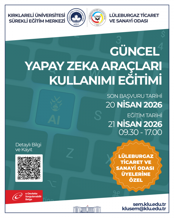 Kırklareli Üniversitesi Sürekli Eğitim Uygulama ve Araştırma Merkezi bünyesinde 21 Nisan 2026 tarihinde Lüleburgaz Ticaret ve Sanayi Odası üyelerine özel Güncel Yapay Zeka Araçları Kullanımı Eğitimi açılacaktır.